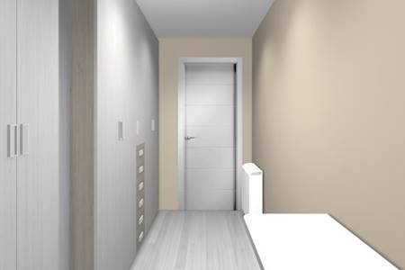 La habitación tiene un tamaño de 4x2 metros, con una puerta ubicada en una de las paredes estrechas y una ventana en la pared opuesta. La presencia de ambos elementos influye en la disposición del mobiliario, ya que queremos permitir la entrada de luz natural a la zona de estudio sin obstaculizar la circulación. La estrategia clave es aprovechar al máximo las paredes más largas, de 4 metros, para colocar los muebles de almacenamiento y la zona de trabajo.